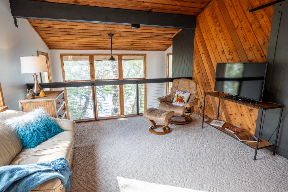 The cabin offers a private dock that provides a serene spot for watching loons and other wildlife, fishing, basking in sunsets, admiring the stars under the darkest skies in Wisconsin, and launching your paddleboard for an adventure on the Lake. If you're looking for entertainment, retreat to one of the two entertainment spaces in the loft and the basement, each equipped with a TV for relaxation.