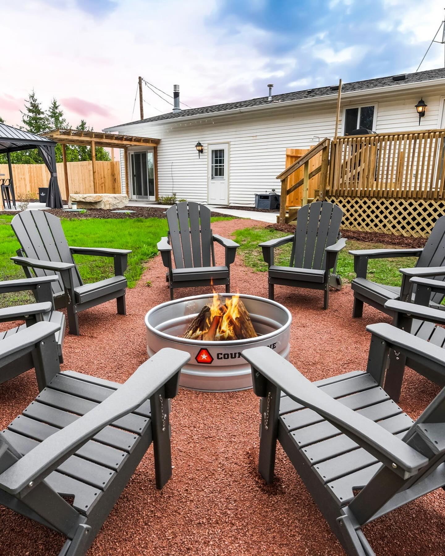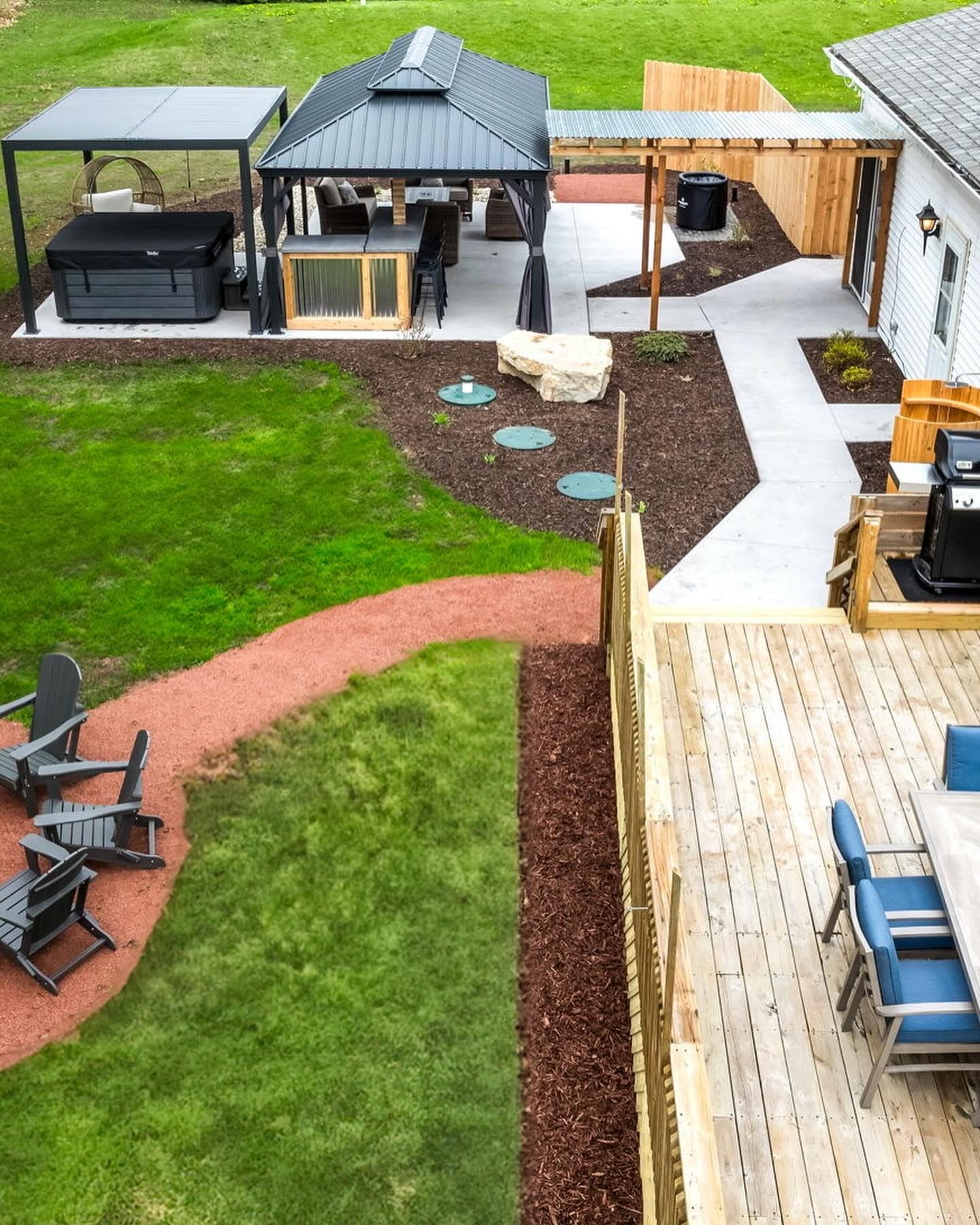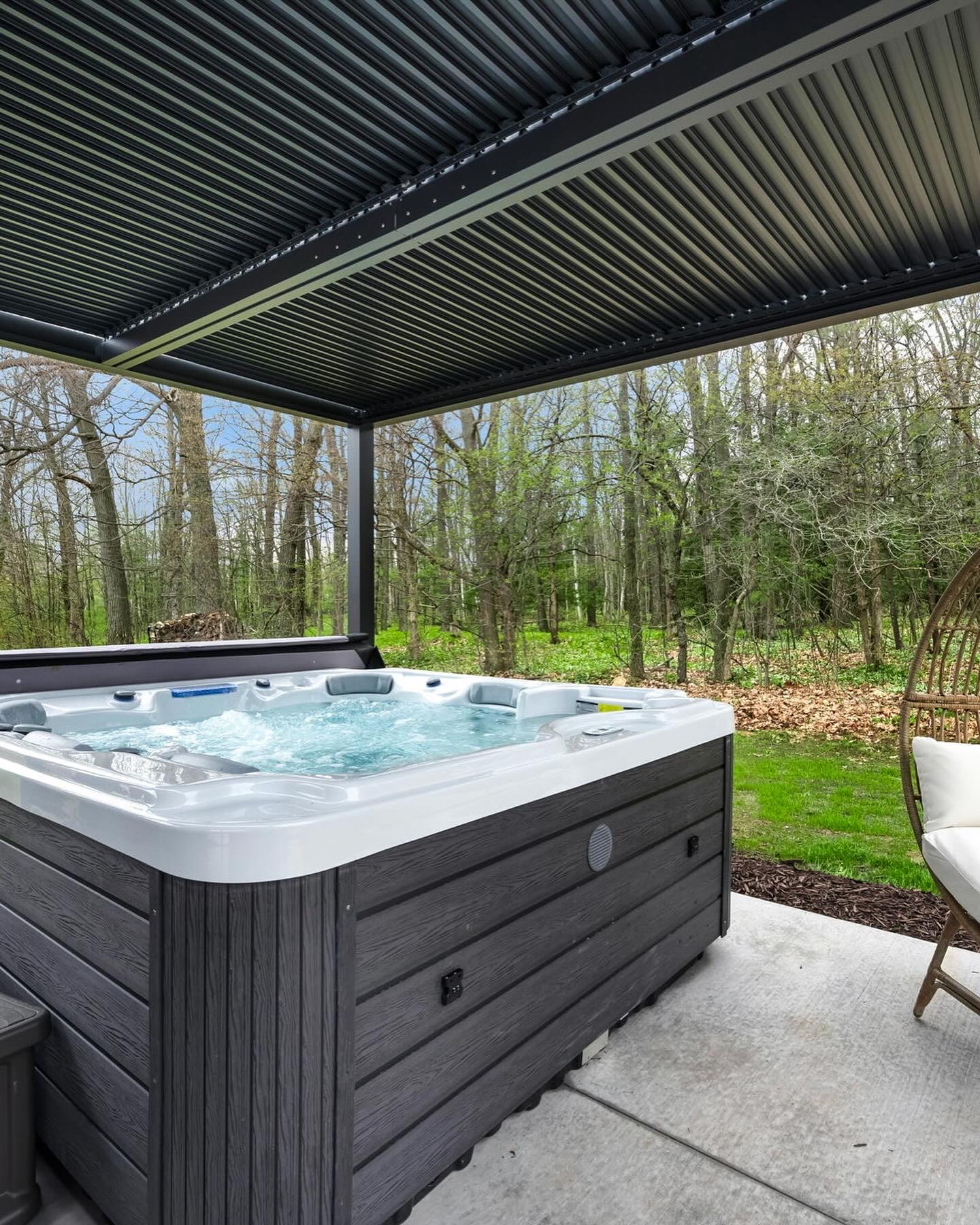 Picture a secluded vacation rental tucked away in the serene landscape of Egg Harbor, offering an oasis of relaxation and luxury. Step outside onto the expansive outdoor area, sheltered by a charming pergola adorned with twinkling lights, creating a magical ambiance. Plush outdoor seating invites you to unwind beneath the open sky.