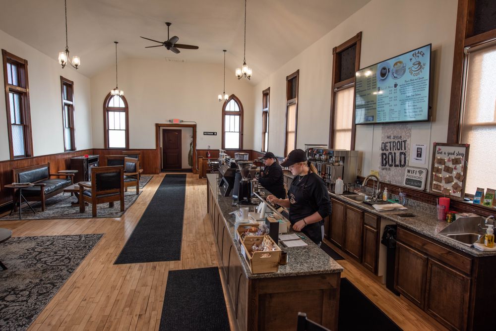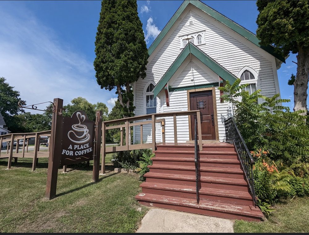 Imagine relaxing in a cozy coffee house set inside a charming old church. It's a wonderful spot to sit back, enjoy a comforting cup of coffee, and catch up with friends. Alongside their great coffee, they also offer delicious pre-packaged muffins, biscotti, and pastries. It's the perfect place to unwind and enjoy some tasty treats!