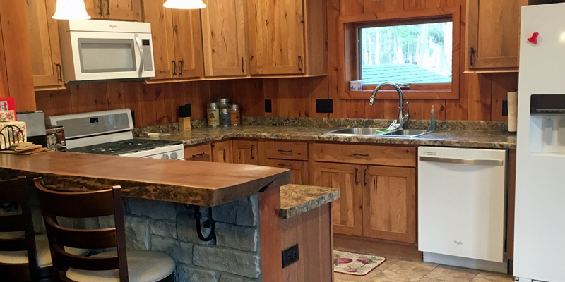 The Homestead's interior has been completely renovated and is now open for rentals. The kitchen is fully equipped with a new stove, microwave, dishwasher, and refrigerator. There is an abundant amount of cabinet and counter space that is fully stocked for all your dining needs! The dining room comfortably seats 8-10 people and also has a breakfast bar that seats 3 more! The living room remains a cozy gathering place around the grand fieldstone wood-burning fireplace. There is plenty of seating to read a good book or two, a 32'' smart TV, and a desk for those who want to bring a laptop.