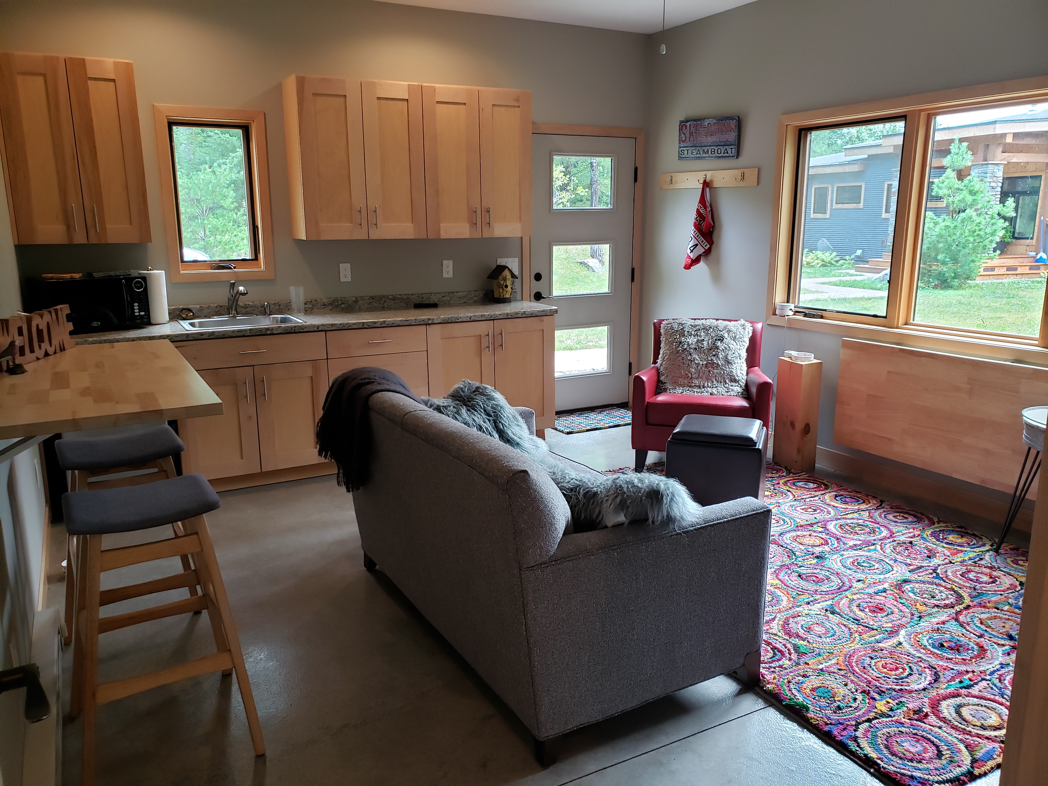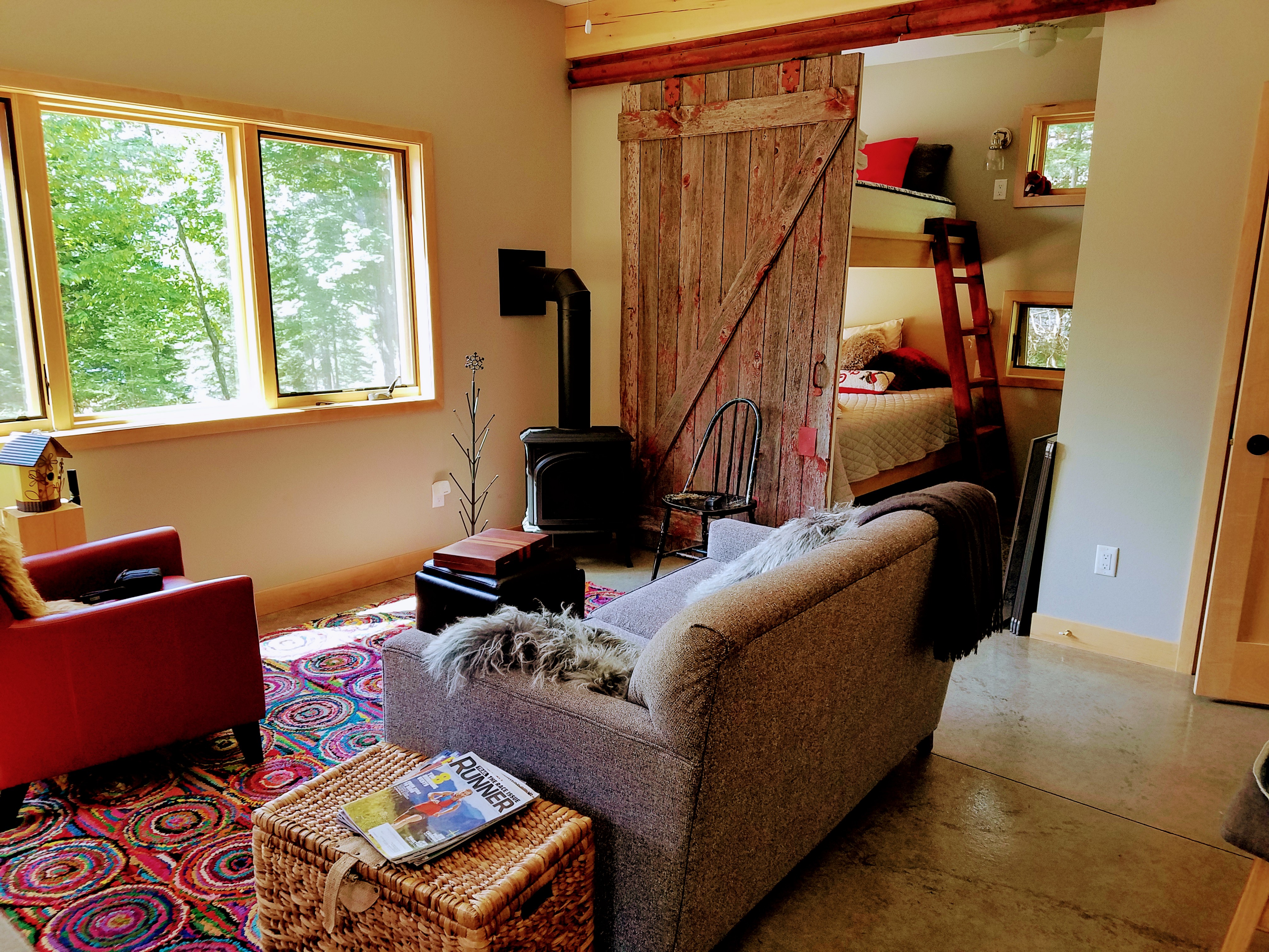 Contemporary, peaceful retreat on Rush Lake. Near paved bike path and snowmobile trails. Over 1000 acres of great fishing from the dock. Queen/double bunks, sleeps 3. Cedar barrel sauna, kayaks, smoke free, great for couples or small family.
