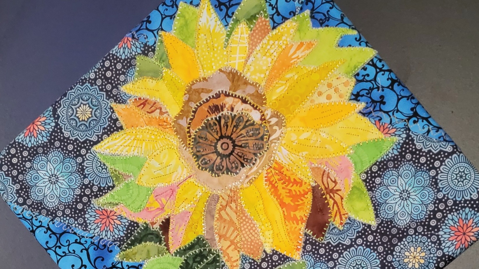 Trish Trinrud and her husband moved here to Portage in 1977 and were teachers till their retirement. Trish began making fabric canvases in 2020 when COVID-19 left most of us locked down and needing something to occupy our time. Trinrud uses contrasting colors as it appear more abstract. She uses bright colors because they bring smiles and joy to those who observe them.