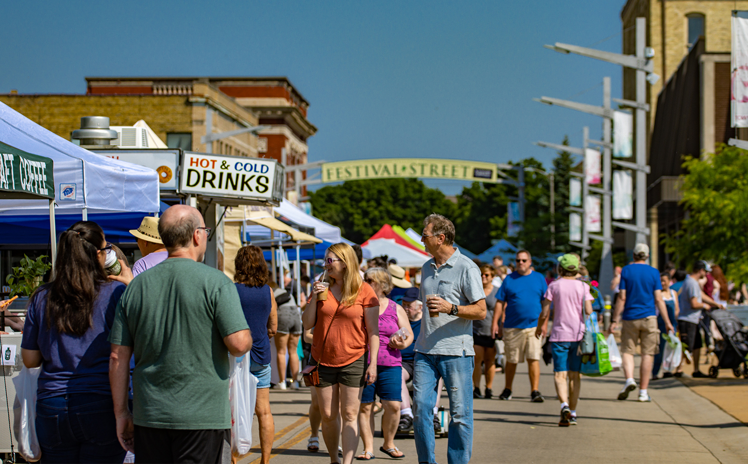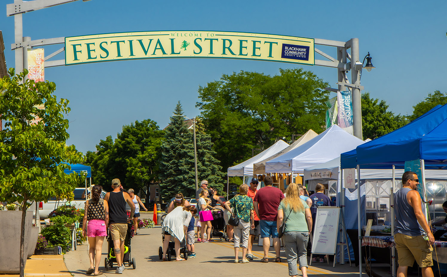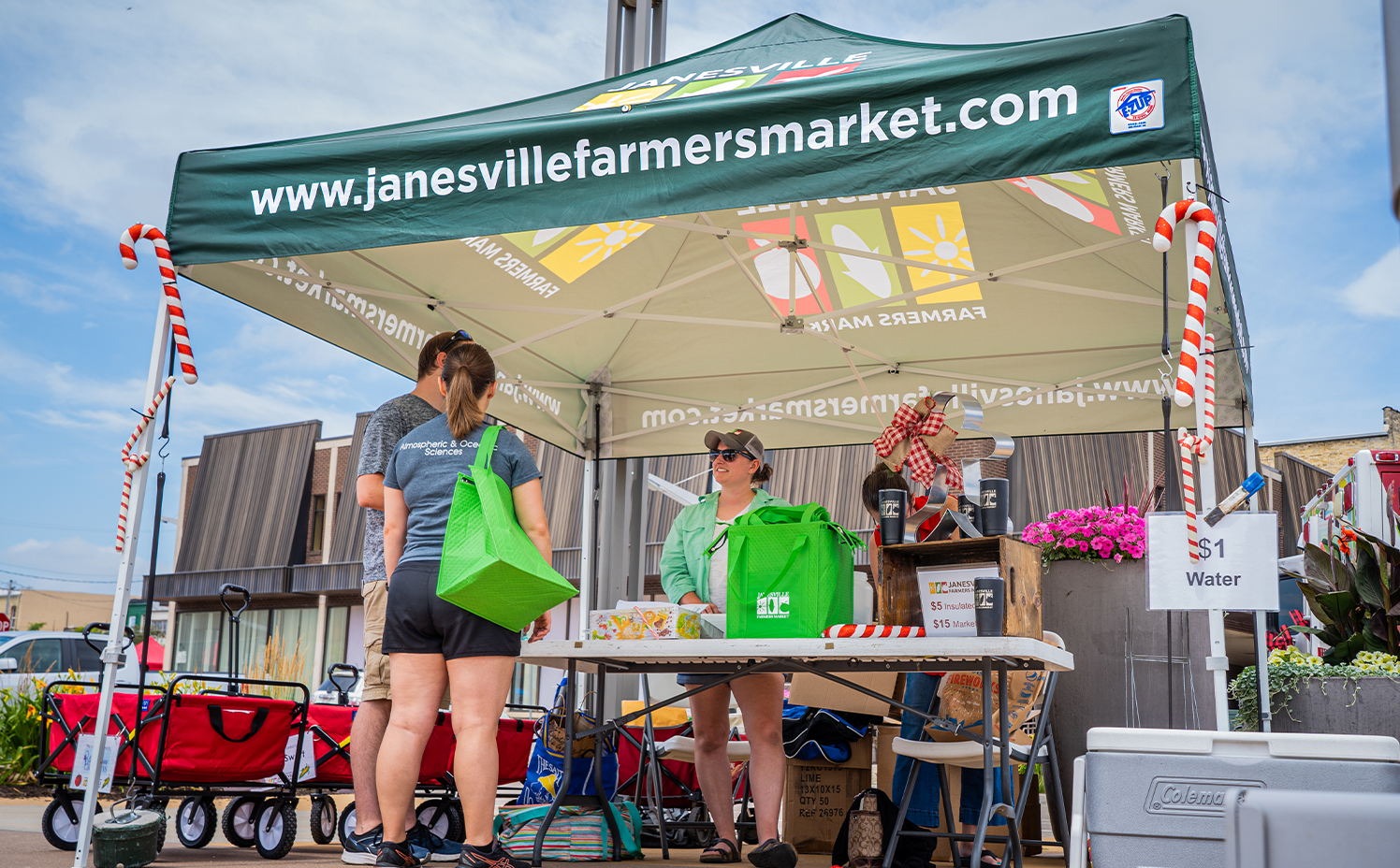 Now encompassing both sides of the river at Janesville's beautiful Town Square, the Janesville Farmers Market, Inc is a Wisconsin producer only retail market. Every Saturday from May through October, vendors offer a wide variety of local goods including fresh produce, annual and perennial plants, honey, meat, cheese, eggs, maple syrup, canned goods, bakery, food trucks, cut flowers and high quality artisan products. Live music and children's activities most Saturdays. Well-behaved dogs on 6 foot non-extendable leashes are welcome. Free on and off-street parking in several lots within three blocks of Town Square - leave your purchases at the JFM booth and drive up to get them. Wagons are available to borrow while shopping the market.