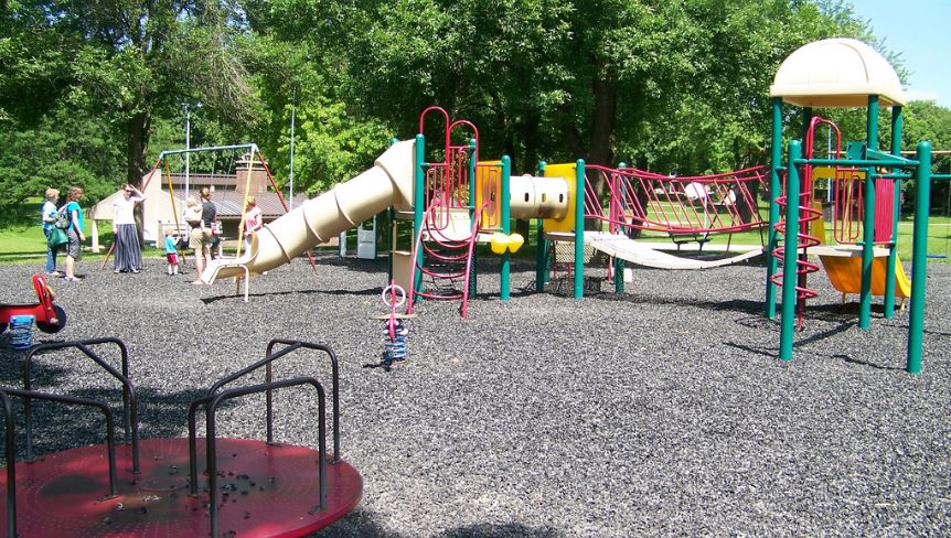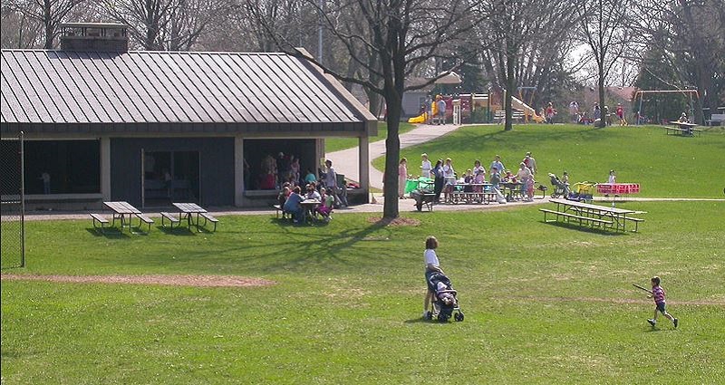 Reservable shelter, basketball court, tennis courts, soccer field, softball field, volleyball court (sand), rock garden, play equipment, ice skating-warming house, lights but no skate rental.