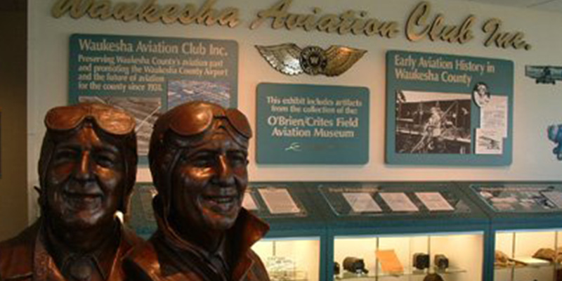 History of Crites Field beginning in 1938, model of 1st plane that landed in Waukesha County in 1912, broken prop from Dean Crites famous no engine landing of a single engine plane.