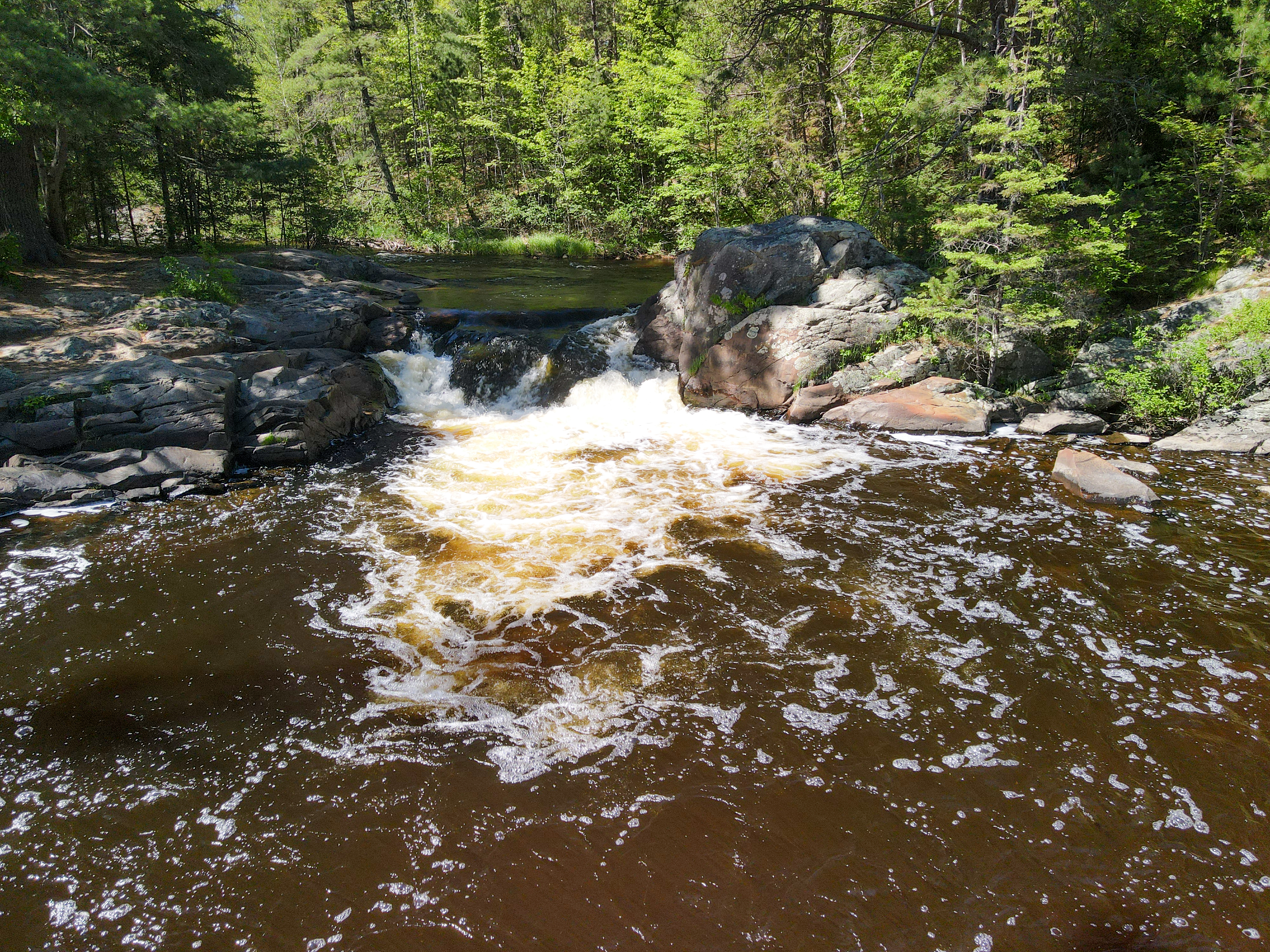 Located just down the river from the Twelve Foot Falls, the easiest way to reach Eight Foot Falls is to walk through the park's campground to a short trail that leads to the falls. The Pike river tumbles over a bouldered ridge into a wide, picturesque pool. The sound from Eight Foot Falls can be heard pleasantly in the background at that end of the campground, and is a wonderful "sedative" at the end of the day.