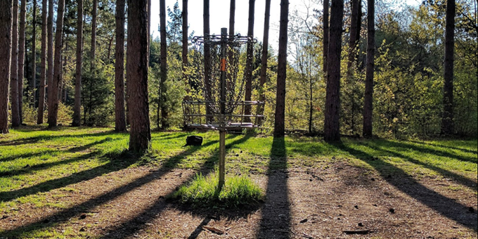 An 18-hole championship level disc golf course. While the elevation is flat, the fairways are tight, wooded and long.
