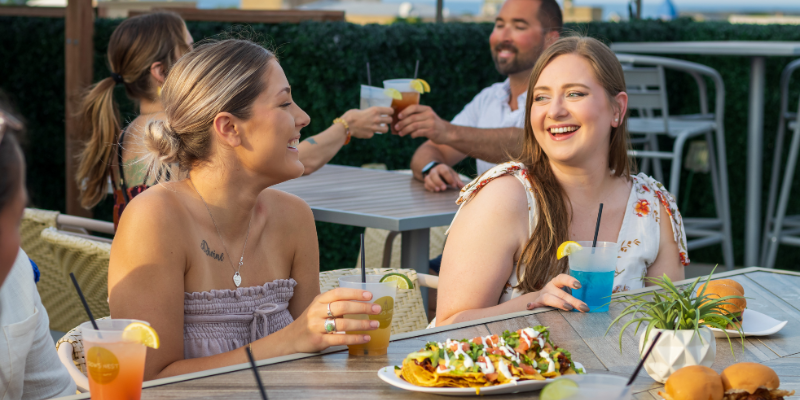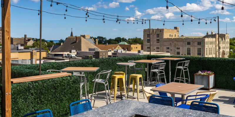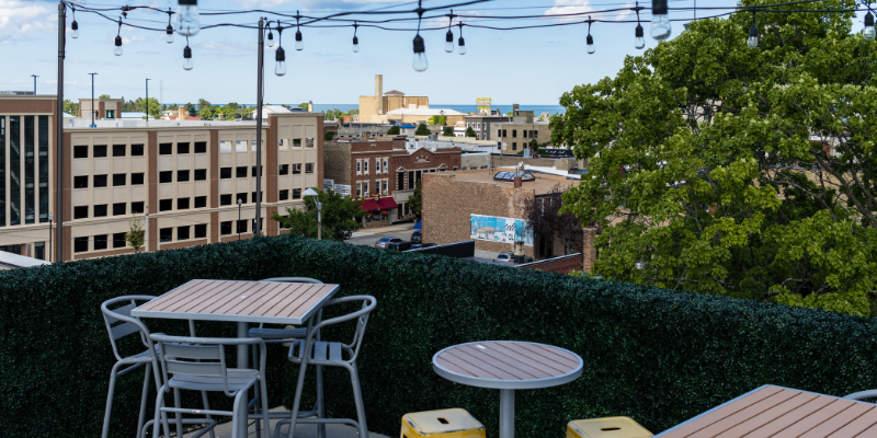 Experience panoramic rooftop views of historic downtown Kenosha and Lake Michigan, signature craft cocktails, and a tasteful menu of snacks and shareables at Crow's Nest Rooftop Bar on top of The Stella Hotel & Ballroom. This is the perfect place to wind down in the evening with the cozy glow of our fire pits and the picturesque views of outstanding sunsets.
