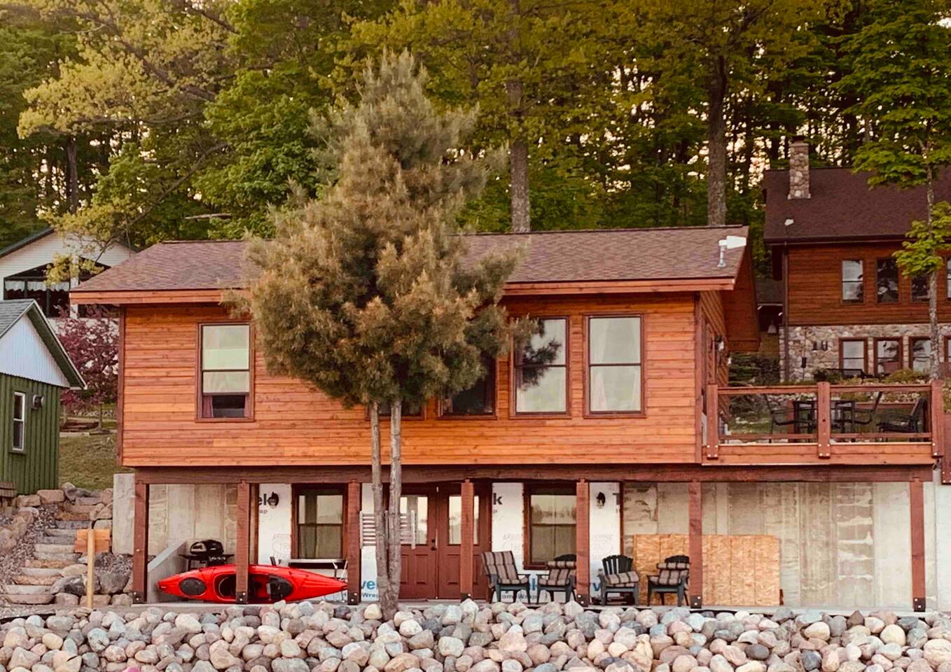 Welcome to our family retreat nestled on the water, in the north woods. Beautiful new build with history. Uno, studio style, is the smaller of the two. Private cabin and deck for sunrises, star-gazing, spotting wildlife such as great blue heron, eagles, loons, trumpeter swans. Boat through wild rice; catch panfish, bass, northern, trout or even a muskie! Uniquely situated; the only private land on quiet peaceful 500-acre Wabikon Lake.
