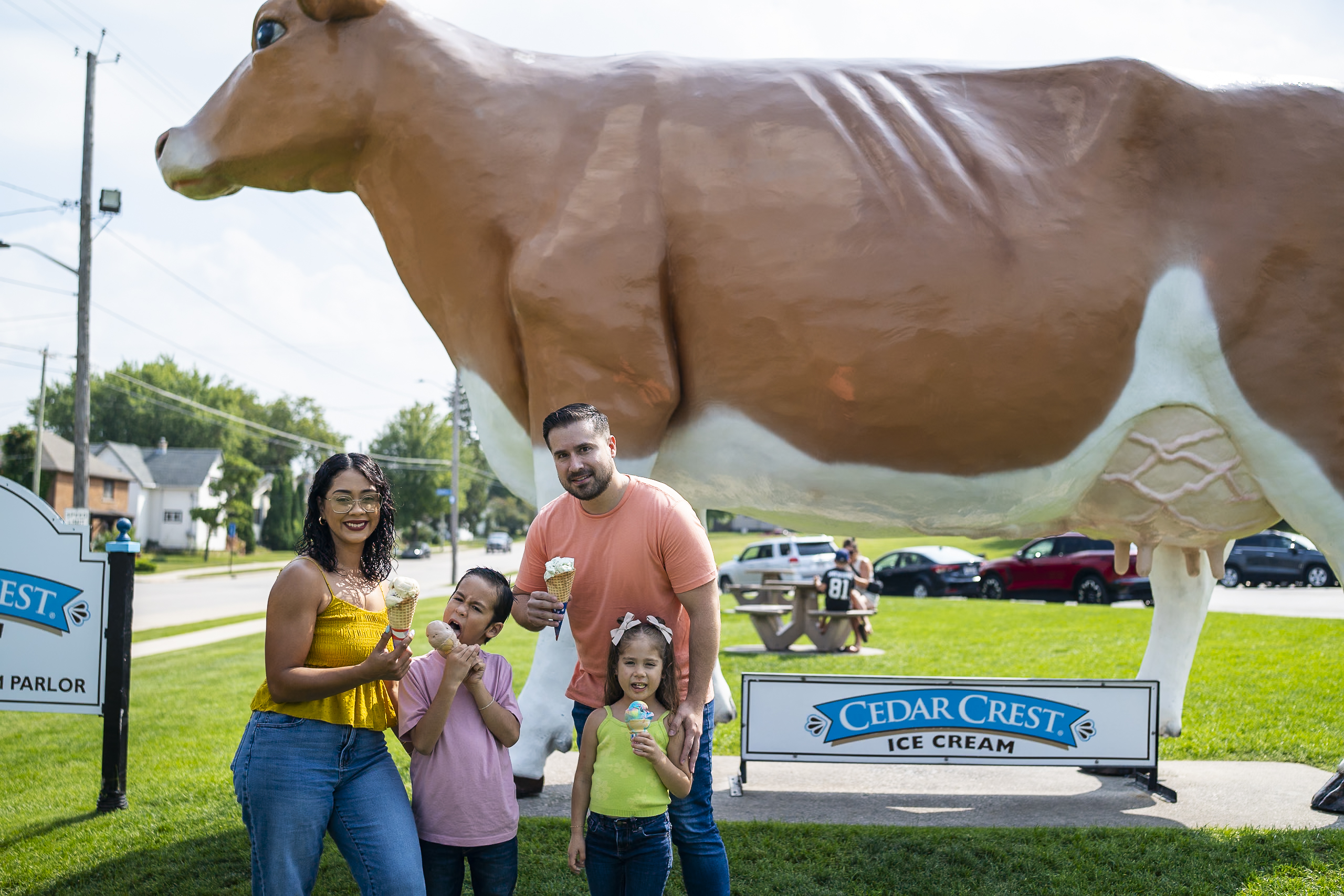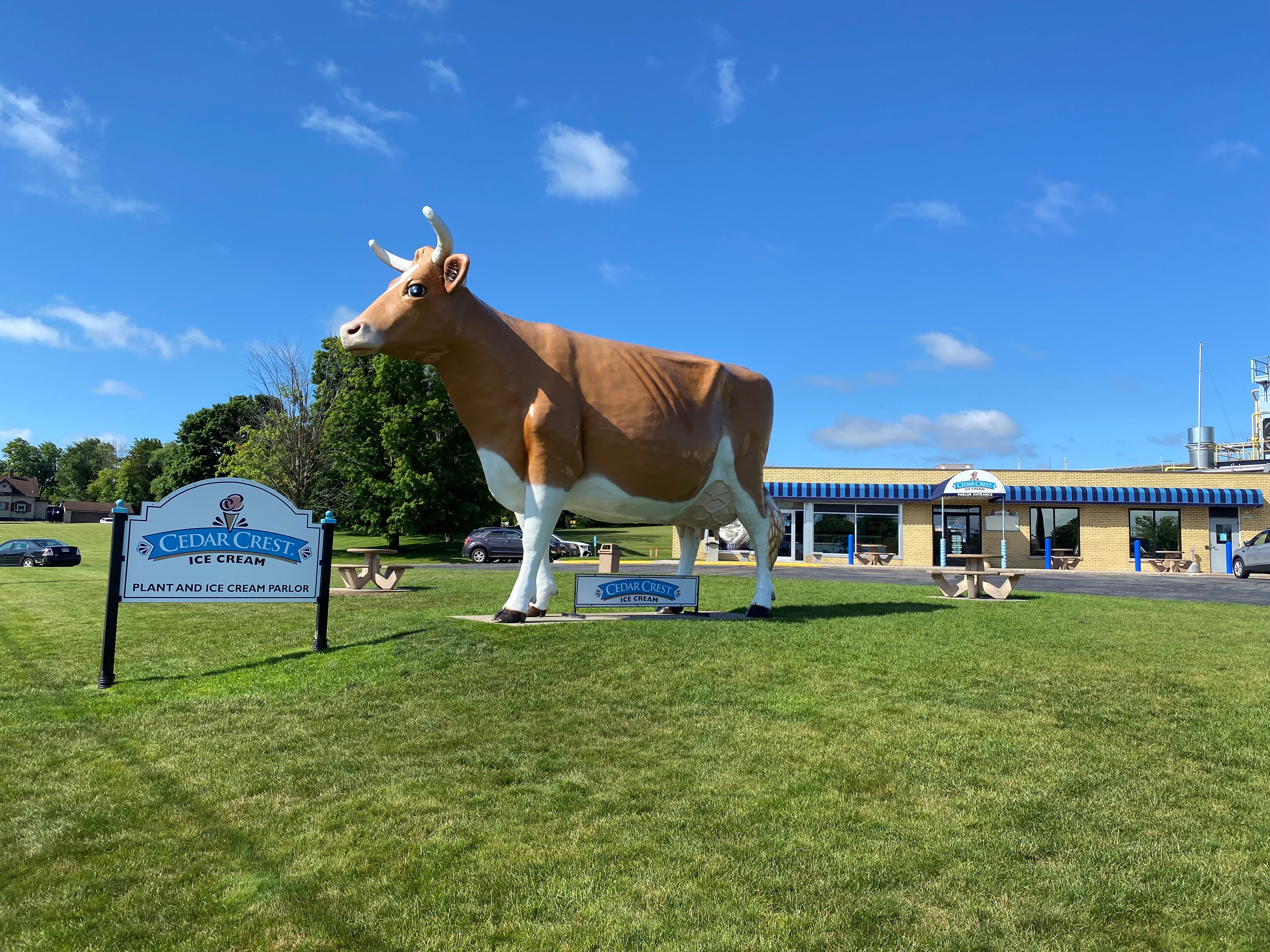 Marked by the iconic "Big Cow," Cedar Crest Ice Cream is a factory and parlor that distributes hard-scoop ice cream across the Midwest and beyond. Stop in March through October for a fresh cone, dish, sundae, malt, or ice cream by the quart. Don't forget your picture in front of the cow!
