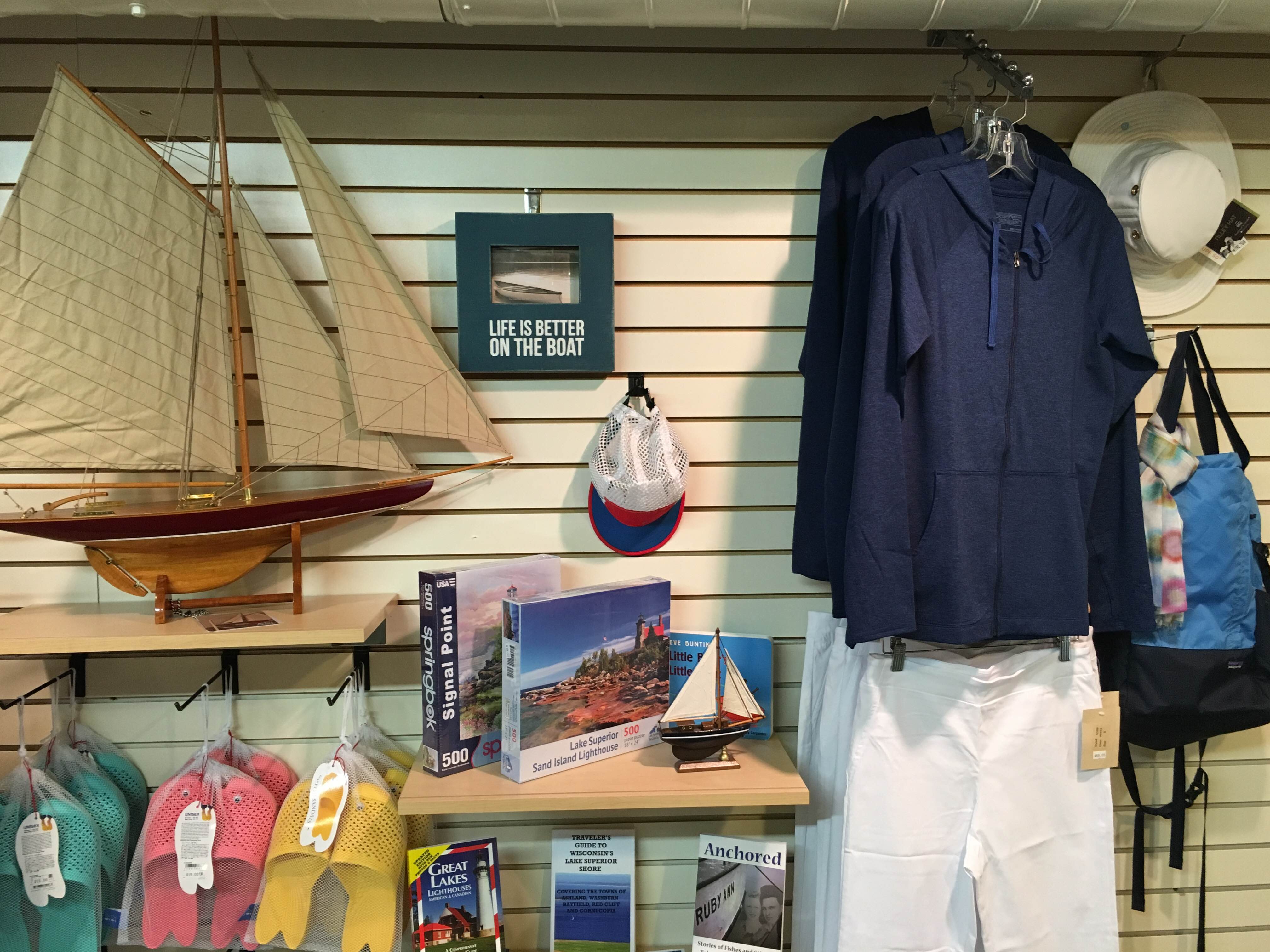 Located on Bayfield's ''main'' street, we feature womens sportswear, jewelry and accessories by companies such as Lole, Patagonia, Royal Robbins, Nomadic Traders, and Arcteryx. We also carry Nautical Gifts, Home Decor, Hallmark cards, Books, and Apostle Islands Gifts & Souvenirs. Visit our children's section for all of your youthful gift needs. Our second floor features creative energy and excitement for yarn, knitting & crochet enthusiasts.