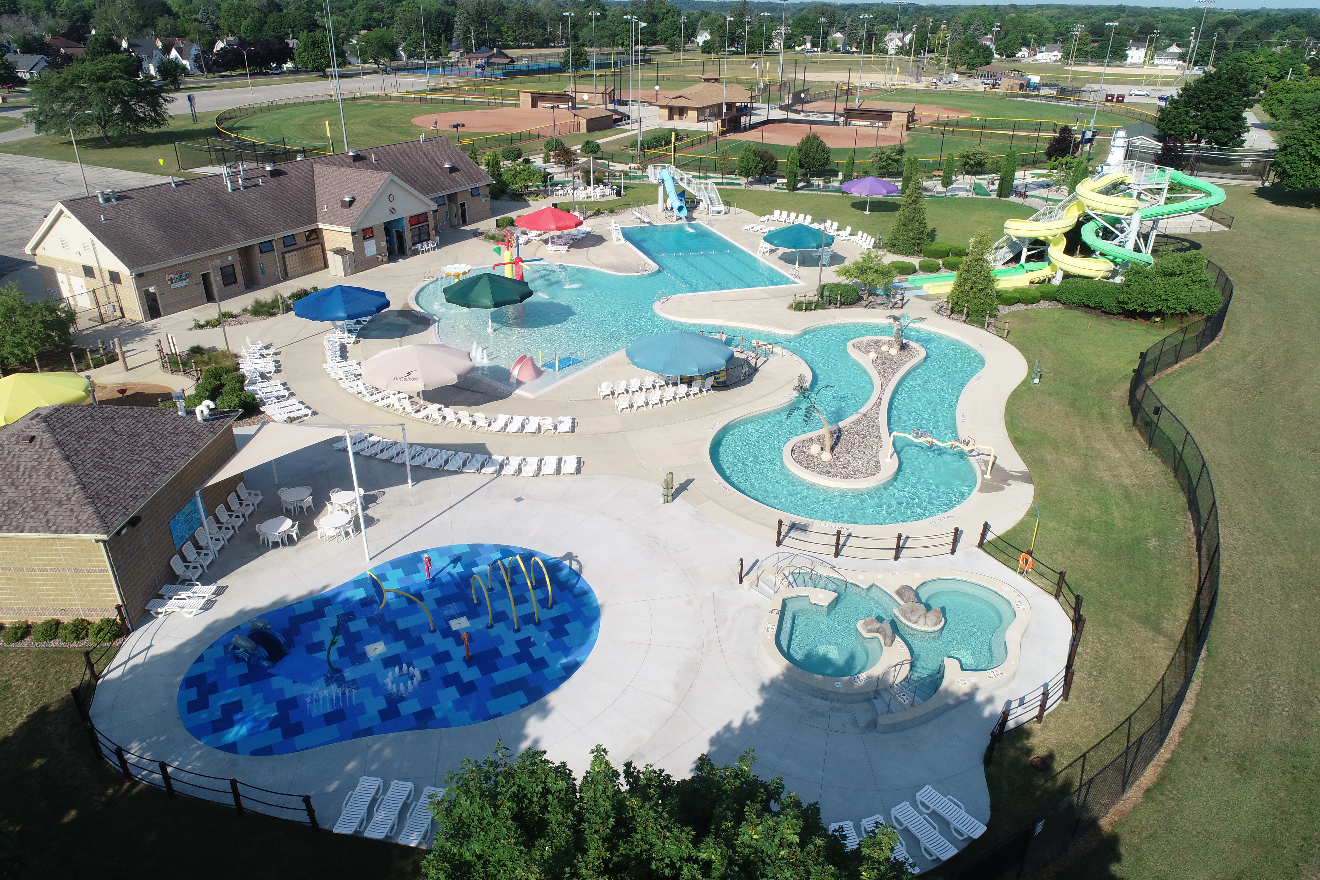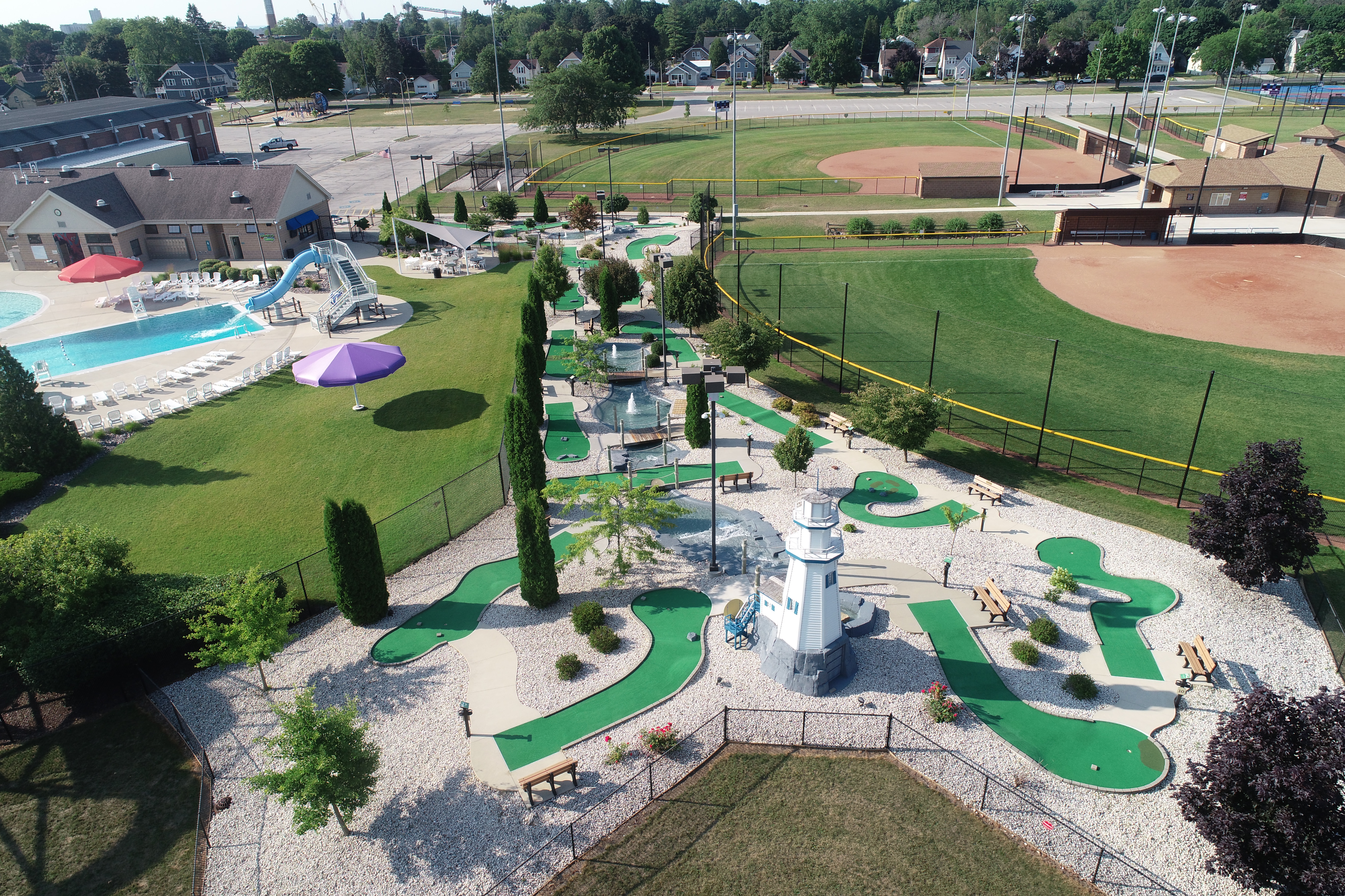 The Manitowoc Family Aquatic Center also has a fun mini golf course located just outside the pool area. Baseball fields, playgrounds, and pickleball and tennis courts are nearby outside the pool to complete your day of outdoor recreation.