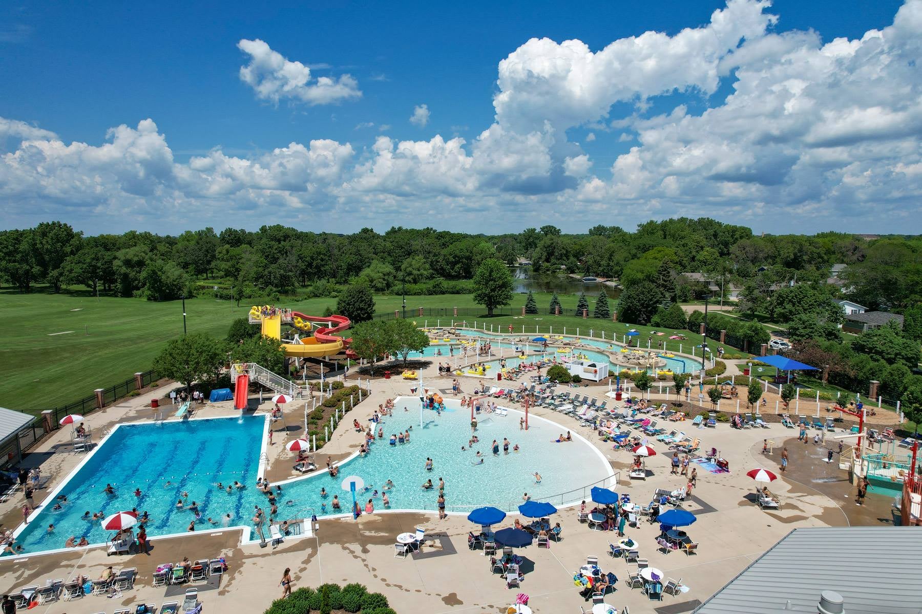 The water park boasts a water slide, an inner-tube slide, a "Lazy River: dotted with waterfalls and water buckets to get wet, swimming pool, modern concession stand, children's play area and much, much more.